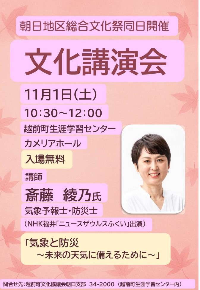 斎藤 綾乃 11/1(土) 朝日地区総合文化祭にて講演 2025 11/10 ニュース 気象予報士の活動 講演 / 出演内容 講演会・イベント出演 2025年11月10日 「気象と防災~未来の天気に備えるために~」 朝日地区総合文化祭と同日開催!日時:11月1日(土)10:30~12:00場所:越前町生涯学習センターカメリアホールお問い合わせは越前町文化協議会朝日支部まで!TEL 34-2000 斎藤綾乃のプロフィール Profile その他の活動・出演情報 Activity 2025年11月30日 斎藤綾乃 斎藤綾乃 11/26(水) 富山市内にて講演 2025年10月20日 斎藤綾乃 斎藤 綾乃 11/1(土) 朝日地区総合文化祭にて講演 2025年6月27日 斎藤綾乃 斎藤 綾乃 10/5(日) 「ちゃまハイ2025 勝山市俳句大会」にて講演 活動・出演情報一覧へ ニュース 気象予報士の活動 講演 / 出演内容 講演会・イベント出演 斎藤綾乃