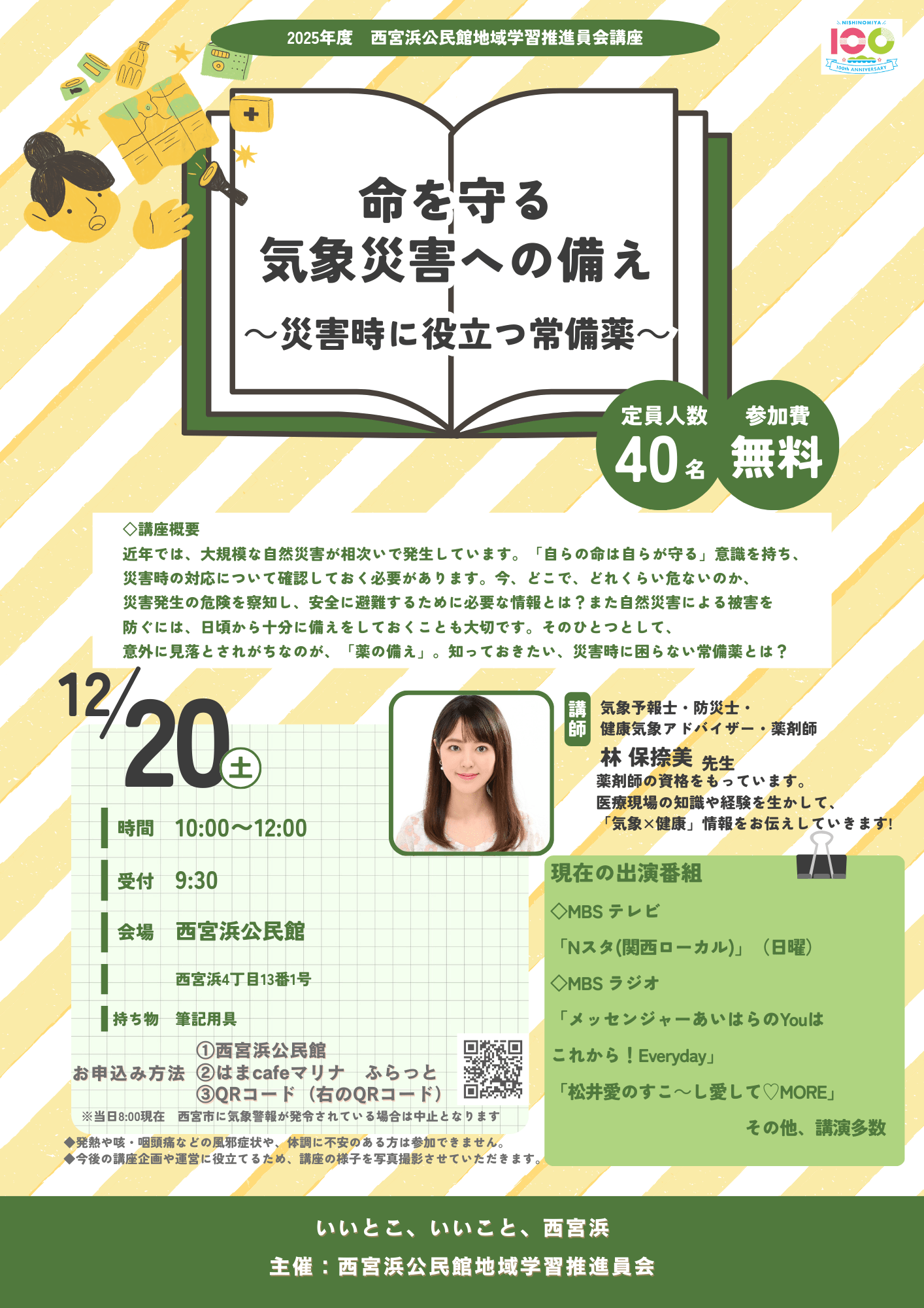 林保捺美 12/20(土)西宮浜公民館にて講演 2025 12/22 ニュース 気象予報士の活動 講演 / 出演内容 講演会・イベント出演 2025年12月22日 12月20日(土) 西宮浜公民館にて『命を守る 気象災害への備え~災害時に役立つ常備薬~』の講演を行いました。 お越しくださった皆さまありがとうございました! 日時:2025年12月20日(土)10:00~場所:西宮浜公民館参加費:無料 お申し込みはコチラ 林保捺美のプロフィール Profile その他の活動・出演情報 Activity 2025年12月23日 林保捺美 前田智宏 12/31(水) MBS『大みそかだよ!渋谷凪咲の関西お天気LIVE2025』出演 2025年12月2日 林保捺美 林保捺美 12/20(土)西宮浜公民館にて講演 2025年11月11日 林保捺美 林保捺美 11/17(月)MBSラジオ「上泉雄一のええなぁ!」に出演 活動・出演情報一覧へ ニュース 気象予報士の活動 講演 / 出演内容 講演会・イベント出演 林保捺美