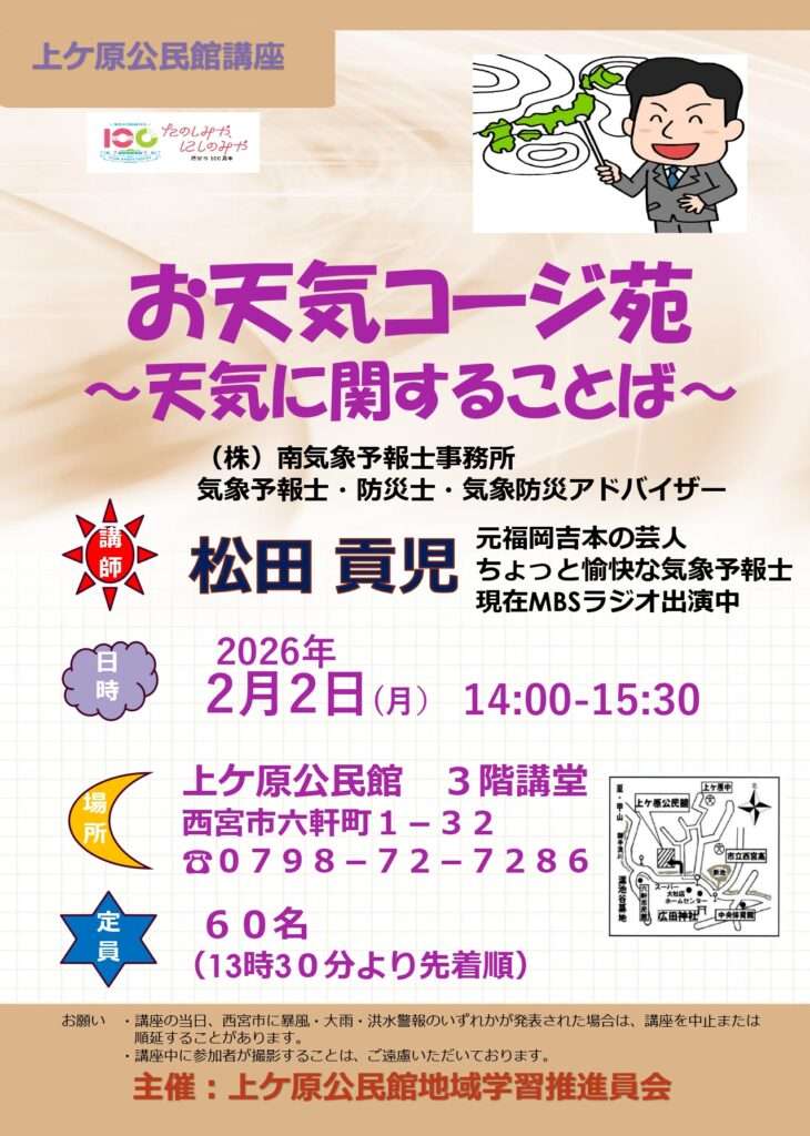 松田貢児 2/2(月) 上ケ原公民館にて「お天気コージ苑~天気に関することば~」開催 2026 1/08 ニュース お知らせ 講演 / 出演内容 講演会・イベント出演 2026年1月8日 『お天気コージ苑~天気に関することば~』日時: 2026年2月2日(月)14:00~15:30場所: 上ケ原公民館 3階講堂定員: 60名(13時30分より先着順)ぜひこの機会に受講してみてください。 松田貢児のプロフィール Profile その他の活動・出演情報 Activity 2025年6月23日 前田智宏 南利幸 松田貢児 吉村真希 林保捺美 【最終回】MBSラジオ『茶屋町お天気部空を見上げて』 活動・出演情報一覧へ ニュース お知らせ 講演 / 出演内容 講演会・イベント出演 松田貢児