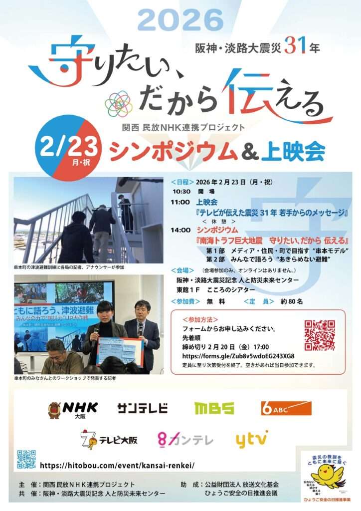 垂水千佳 2/23(月) 「守りたい、だから伝える」プロジェクトにて司会を担当 2026 2/18 ニュース お知らせ 講演 / 出演内容 講演会・イベント出演 2026年2月18日 2/23(月・祝) に人と防災未来センターにて行われる阪神・淡路大震災から31年関西 民放NHK連携プロジェクト「守りたい、だから伝える」にて司会を担当します。 日時:2026年2月23日(月) 11:00~16:00場所:人と防災未来センター参加費:無料参加締め切りは2月20日まで詳細は公式サイトよりチェック! 公式サイト 垂水千佳のプロフィール Profile その他の活動・出演情報 Activity 2026年2月12日 垂水千佳 垂水千佳 2/11(水) 大阪教育大学附属池田小学校にて講座 2025年8月1日 垂水千佳 垂水千佳 10/26(日) NHK文化センター守口教室にて講師担当 2025年8月11日 垂水千佳 垂水千佳 10/25(土) 田辺眞人名誉館長文化サロンにて講師担当 活動・出演情報一覧へ ニュース お知らせ 講演 / 出演内容 講演会・イベント出演 垂水千佳