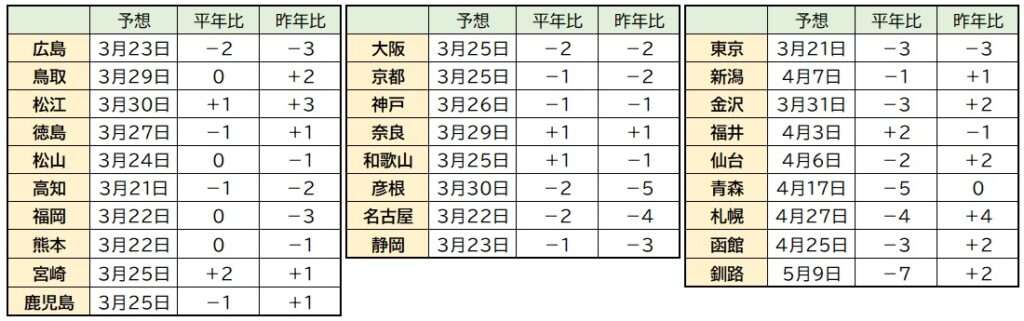 2026年 さくら開花予想 2026 2/06 ニュース 桜情報 2026年2月6日 第1回(2月6日発表 担当:さくらチーム) ソメイヨシノの開花は東京・高知の3月21日スタート予想! 初冬は西日本で平年より気温が高かったものの、1月以降の寒波でやや遅ればせながら休眠打破が進んだか。 3月の気温は平年並みか高い見込みで、開花は概ね平年並みの所が多い見通し。 4月からは平年より気温が高く、特に北日本は早い開花になりそう。次回更新は2月20日(金)予定です。 ニュース 桜情報 独自予想